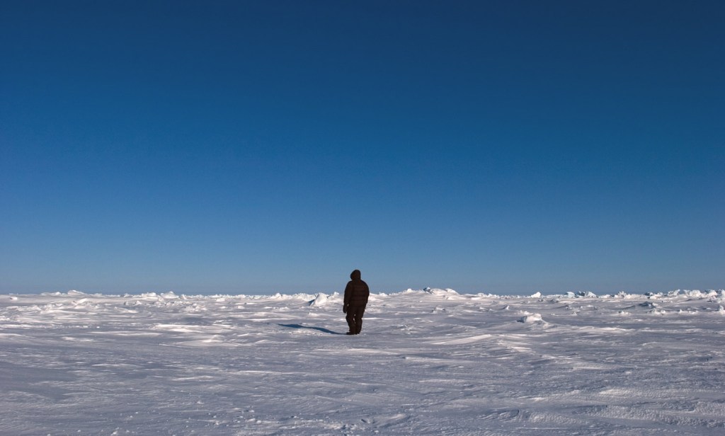 Guido van der Werve’s work The Day I Didn’t Turn with the World (Nummer negen) was filmed at the North Pole. Van der Werve stood on the axis of the world for 24 hours, and moved clockwise while the earth under his feet turned in the opposite direction. The artist’s movement for 24 hours was desynchronized with the movement of the earth. Van der Werve filmed the performance every six seconds, and contracted the 24-hour footage into a nine-minute film, thus generating a sense of stasis when viewed. The monotonous Arctic backdrop remains unchanged; only the artist’s figure appears to make odd movements. The acceleration of the artist’s counter-movement against the motion of the earth generates tension between two antithetical, non-complementary movements.