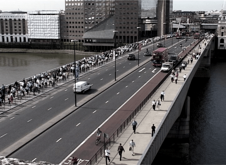 In A Slow Walk for Longplayer, Ohad Fishof crossed the London Bridge on the longest day of the year in 2005. The act began in the early morning rush hour and continued for 9 hours, 43 minutes and 25 seconds. The walk produced a radical contrast between the city and the accelerated elements within it— cars, pedestrians, airplanes, trains, etc.—and the slow-moving body. Instead of photographic techniques which enable deceleration for the purpose of observing details, as customary in scientific video photography, in Fishof’s work the body itself performs the slowing within the space it occupies. It allows for a different type of observation of high-speed urban life, accentuating every basic element of existence (step, breath, turning of the gaze) by stretching it over a long duration. The transformation of basic nuances takes the foreground and is further reinforced by the accelerated pace of life around.