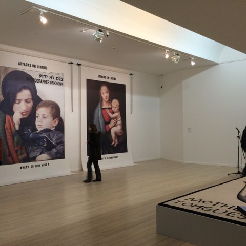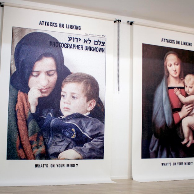 The exhibition Rainbow in the Dark: On the Joy and Torment of Faith ties together works from different geographies, interweaving elements from mainly monotheistic mysticism, symbols and tradition. Trellis of My Mind (1998) by Gülsün Karamustafa is a frieze that includes illustrations copied from Islamic, Christian, and Jewish manuscripts. In her video installation Abraham Abraham / Sarah Sarah (2012), Nira Pereg follows the daily change of artefacts in the Cave of the Patriarchs in Hebron, where a synagogue and a mosque are under the same roof, serving the Jewish